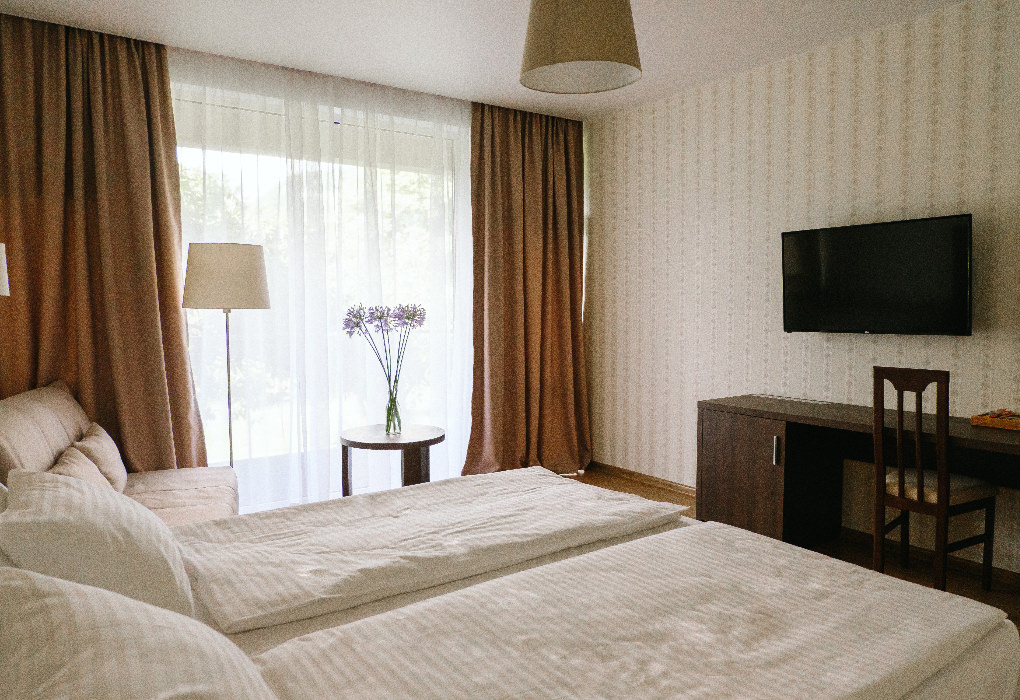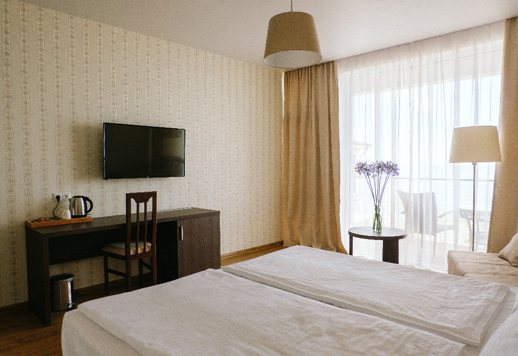 Площадь номера - 30 кв.м. 1 комната. 2 осн. места. вид на море или сад. В номере: телевизор; холодильник; балкон; кондиционер; душ; туалет; фен; 1-спальные/ 2-спальная кровать; чайник. 1 доп. место: